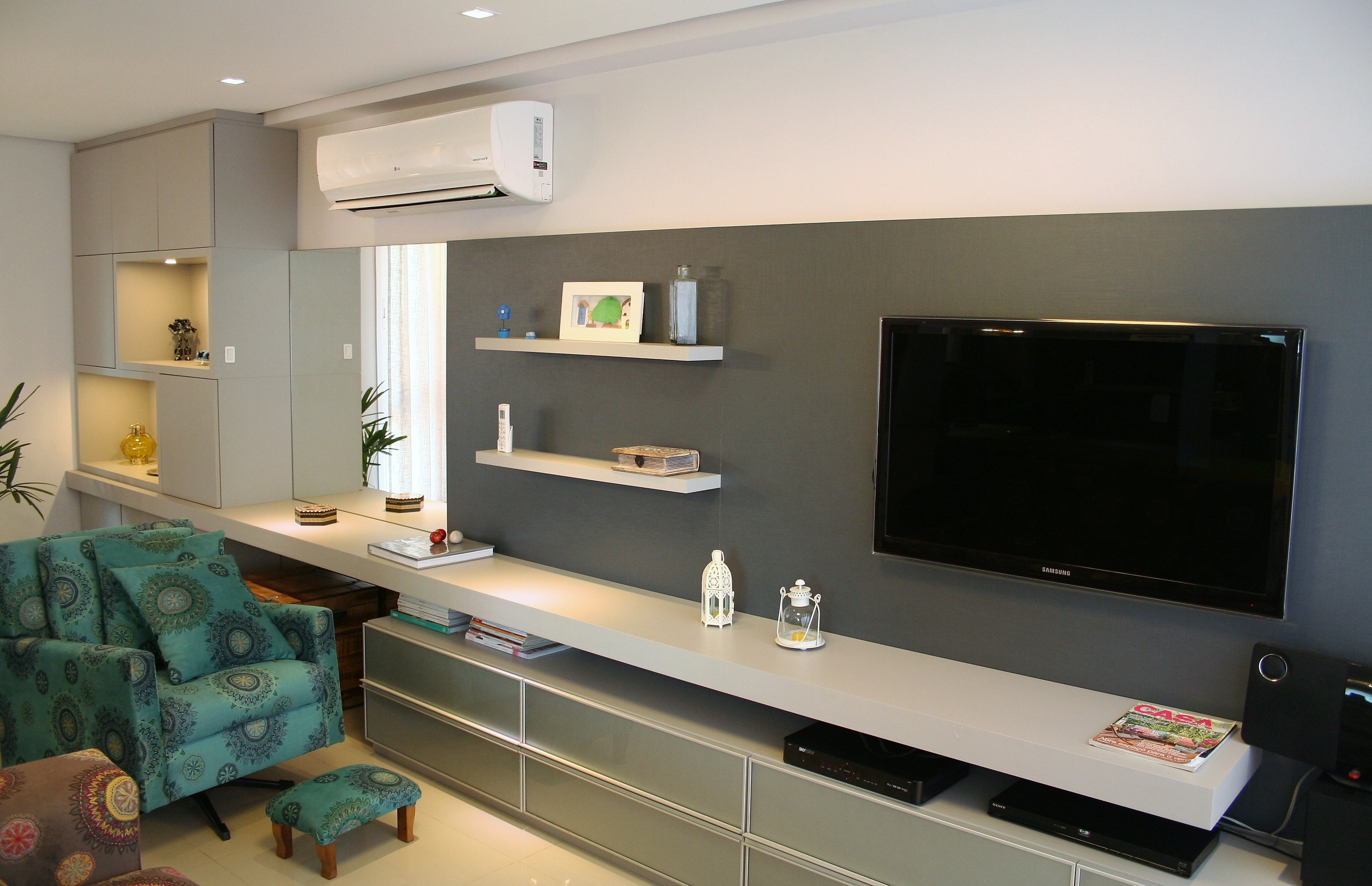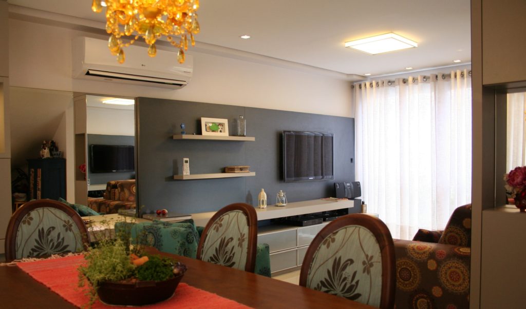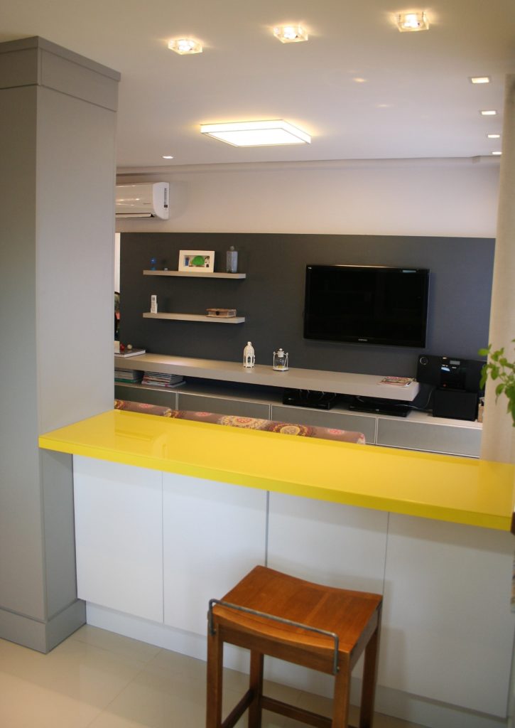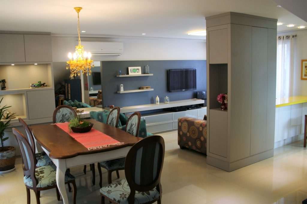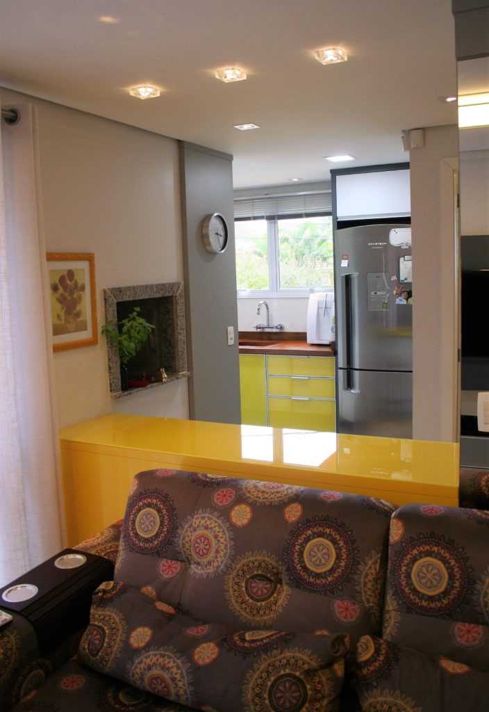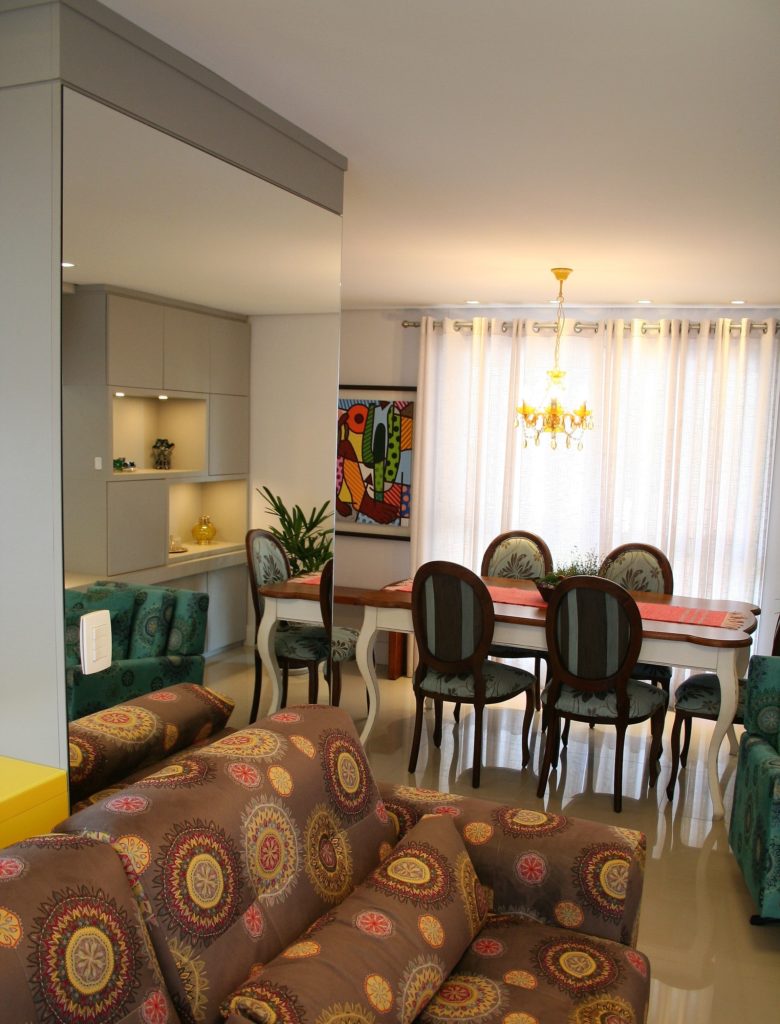 Este sobrado, que fica em um bairro residencial da capital gaúcha, possui sala de estar e jantar integradas a cozinha aonde o grande destaque fica por conta do uso de cores, gosto bastante pessoal da cliente e adotado no mobiliário, nos estofados, nos objetos de decoração e também em alguns itens da iluminação.